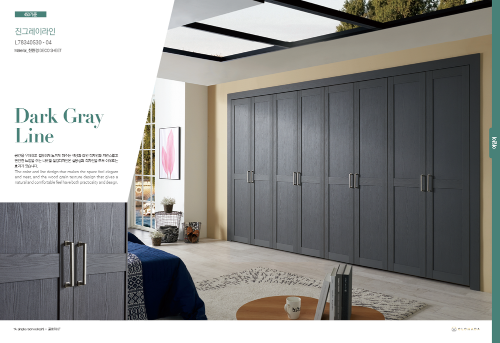 공간을 우아하고 깔끔하게 느끼게 해주는 색상과 라인 디자인과 자연스럽고 편안한 느낌을 주는 나뭇결 질감디자인은 실용성과 디자인을 모두 아우르는 효과가 있습니다.