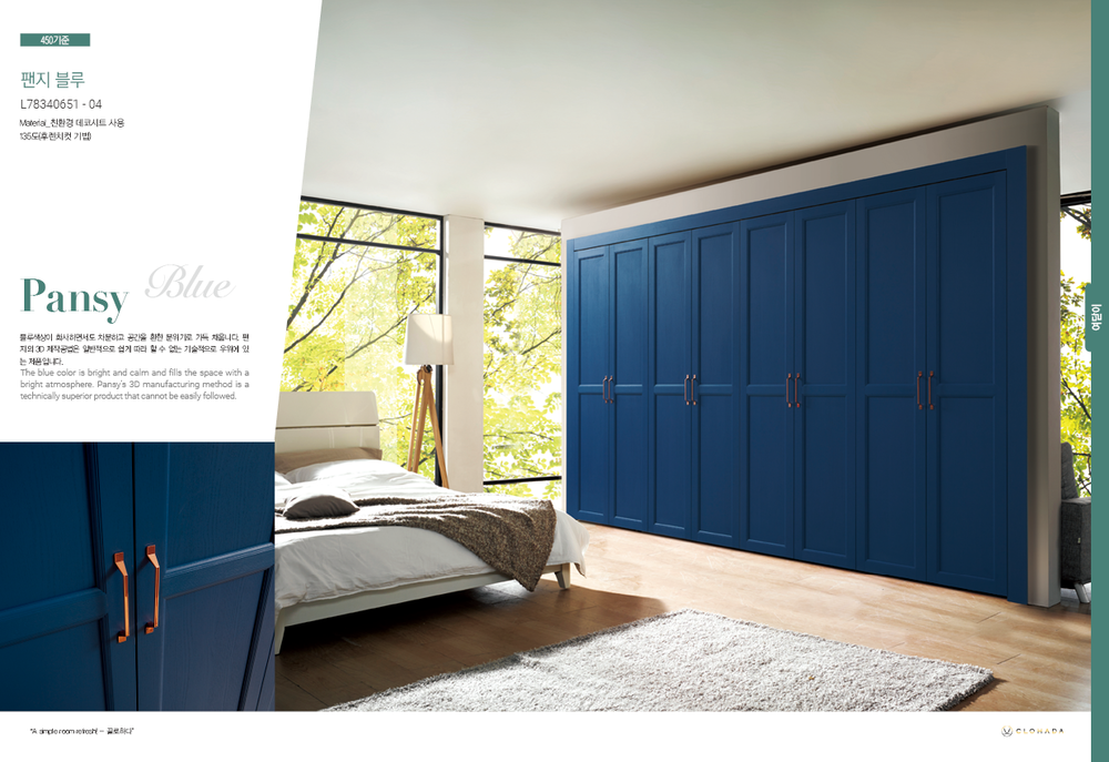 블루색상이 화사하면서도 차분하고 공간을 환한 분위기로 가득 채웁니다. 팬지의 3D 제작공법은 일반적으로 쉽게 따라 할 수 없는 기술적으로 우위에 있는 제품입니다.