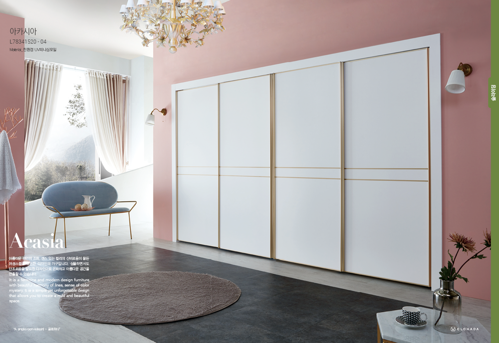 아름다운 라인의 조화, 센스 있는 컬러의 신비로움이 물든 여성스럽고 모던한 디자인의 가구입니다. 심플하면서도 단조로움을 탈피한 디자인으로 온화하고 아름다운 공간을 연출할 수 있습니다.