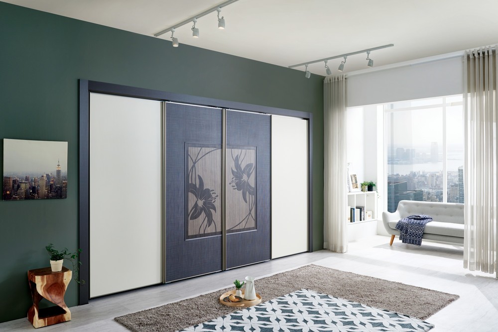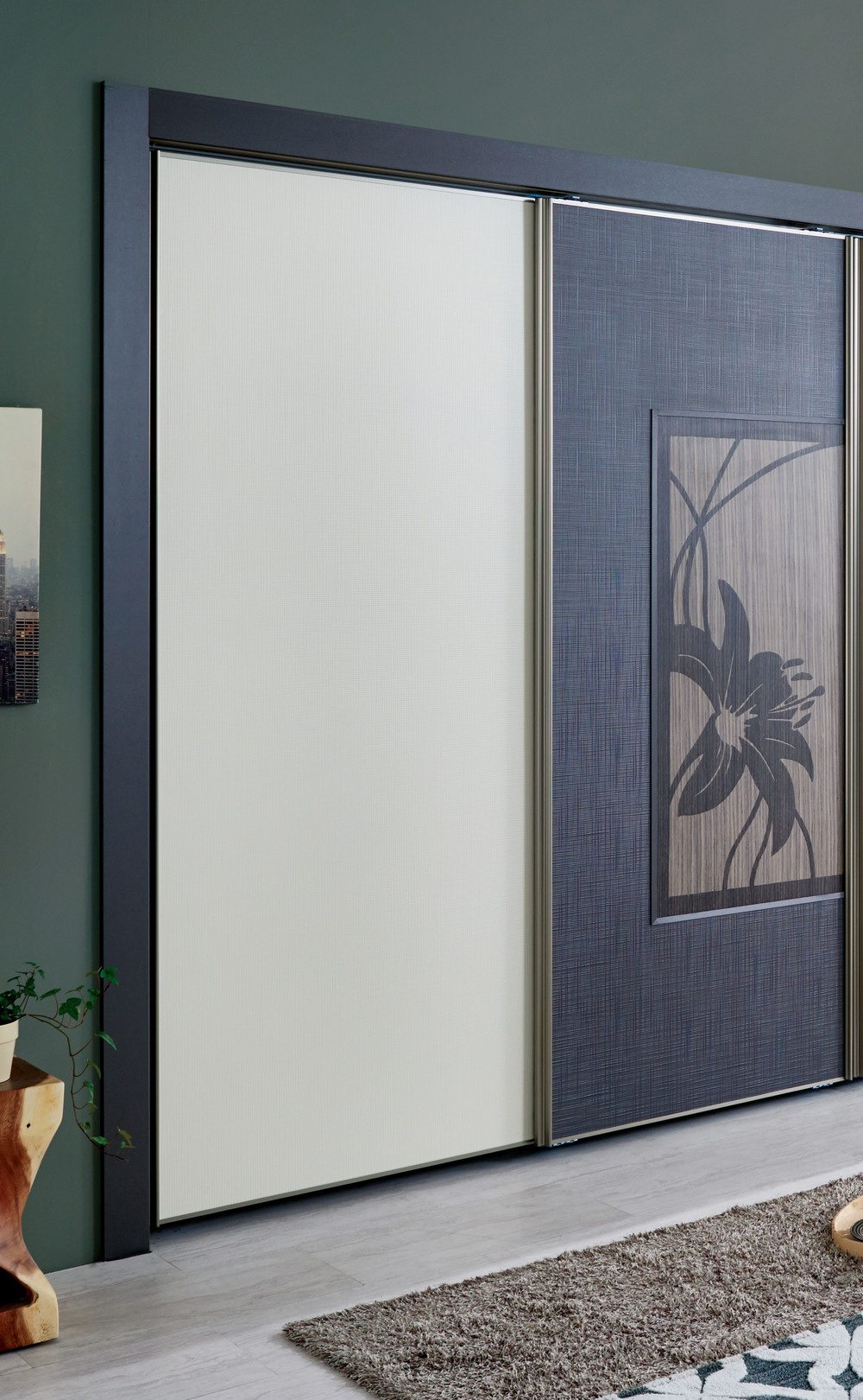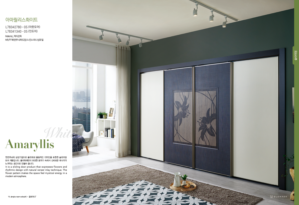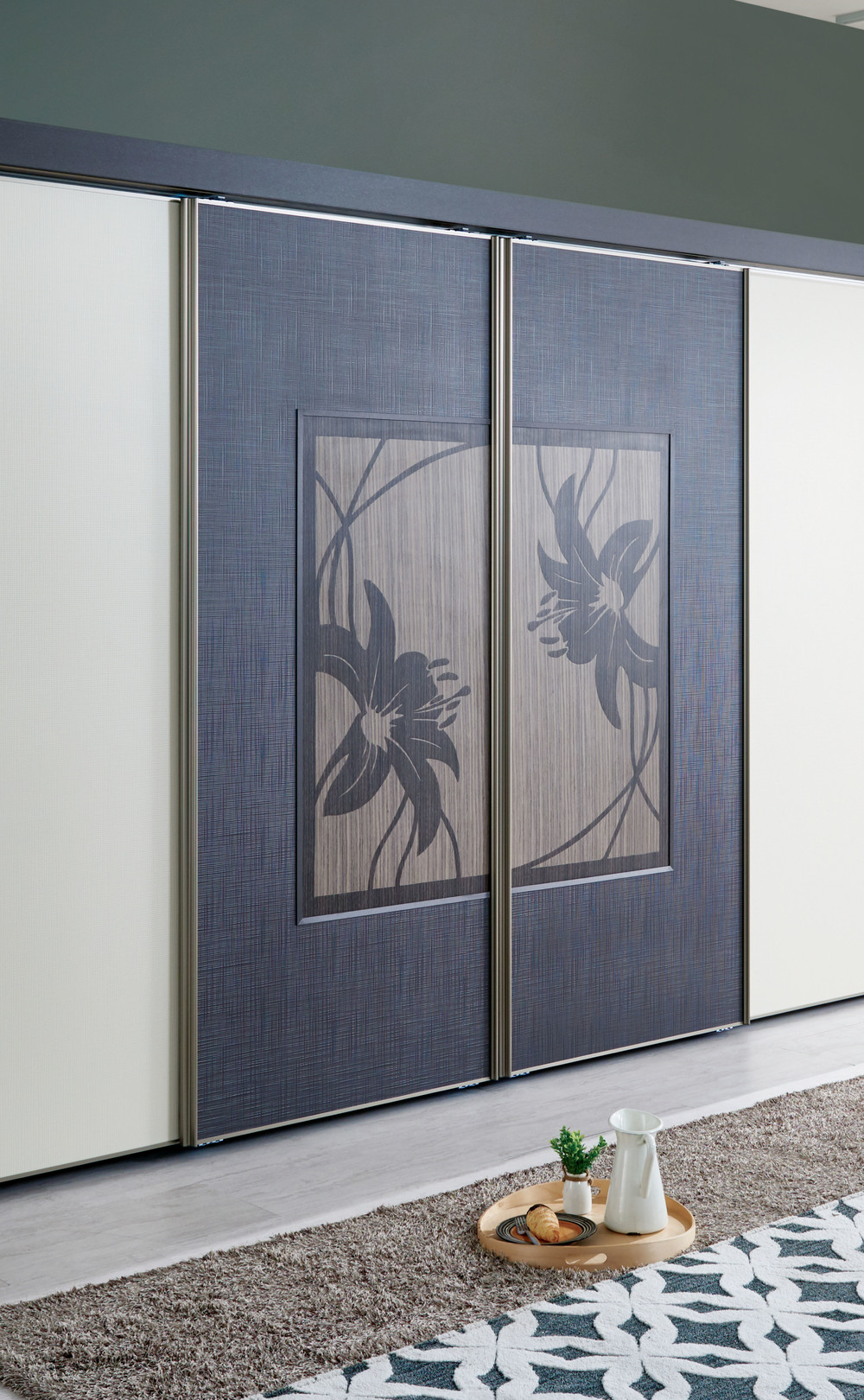 천연무늬목 상감기법으로 플라워와 율동적인 디자인을 표현한 슬라이딩 도어 제품입니다. 플라워패턴이 모던한 분위기 속에서 신비로운 에너지가 느껴지는 공간으로 만들어 줍니다.