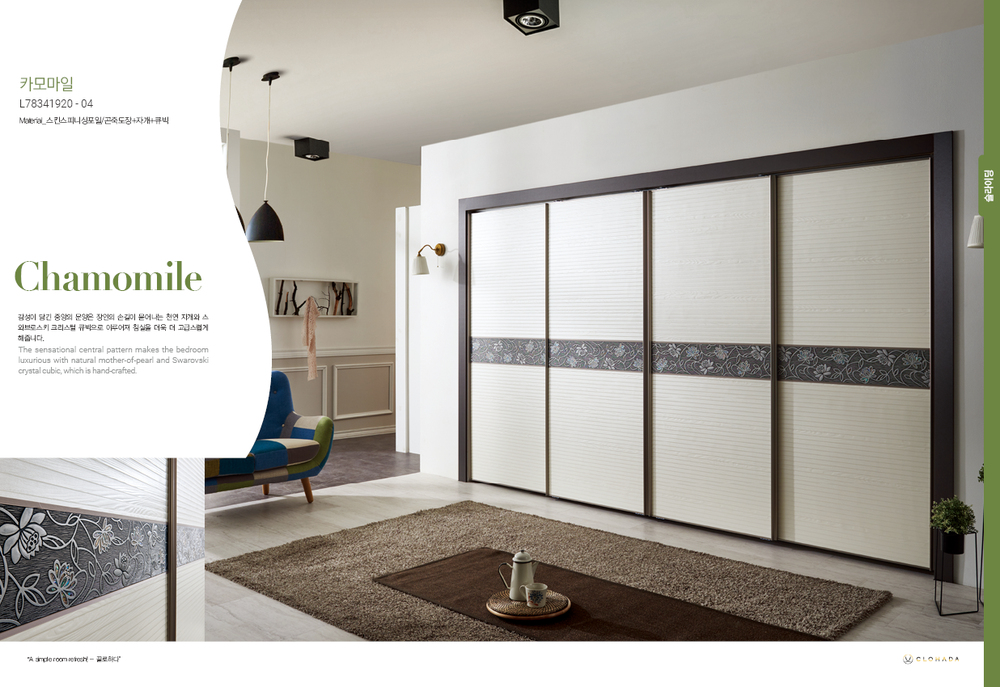 감성이 담긴 중앙의 문양은 장인의 손길이 묻어나는 천연 자개와 스와브로스키 크리스털 큐빅으로 이루어져 침실을 더욱 더 고급스럽게 해줍니다.