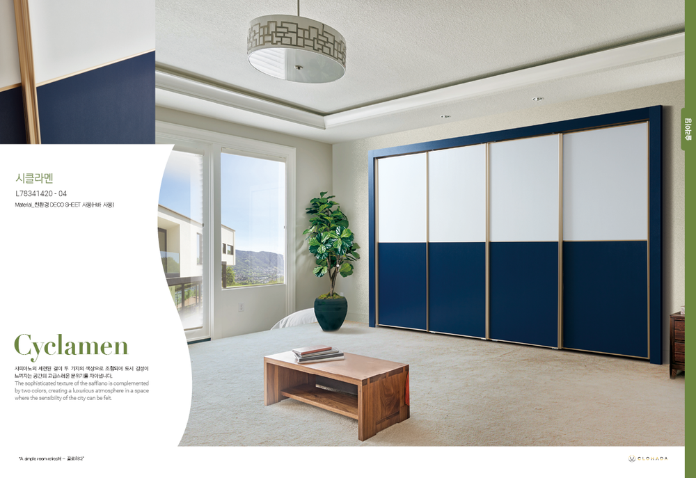 사피아노의 세련된 결이 두 가지의 색상으로 조합되어 도시 감성이 느껴지는 공간의 고급스러운 분위기를 자아냅니다.