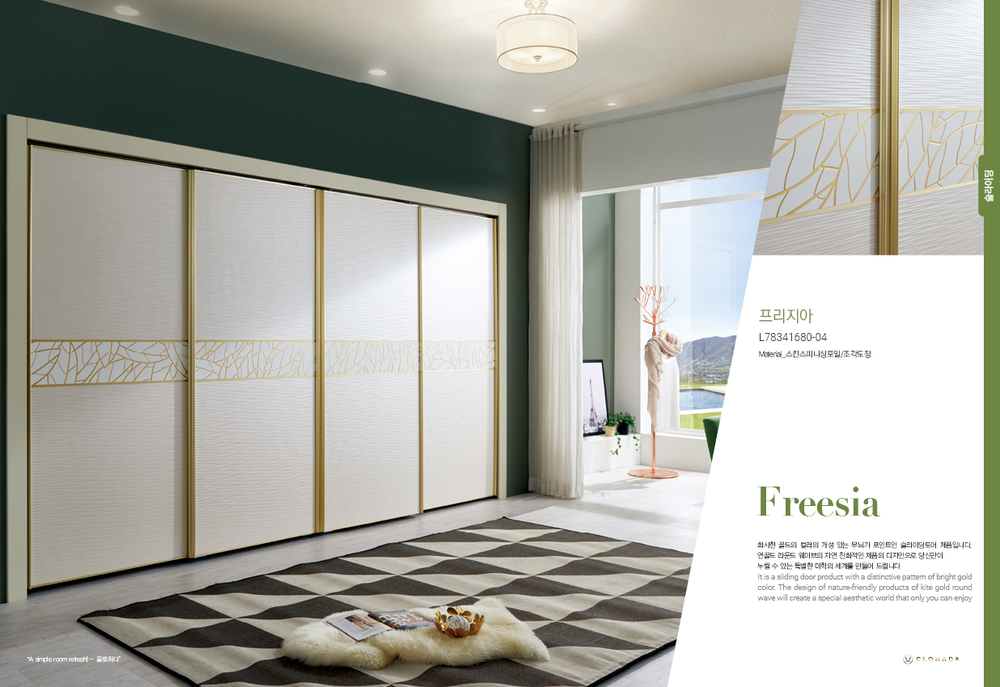 화사한 골드의 컬러의 개성 있는 무늬가 포인트인 슬라이딩도어 제품입니다. 연골드 라운드 웨이브의 자연 친화적인 제품의 디자인으로 당신만이 누릴 수 있는 특별한 미학의 세계를 만들어 드립니다.