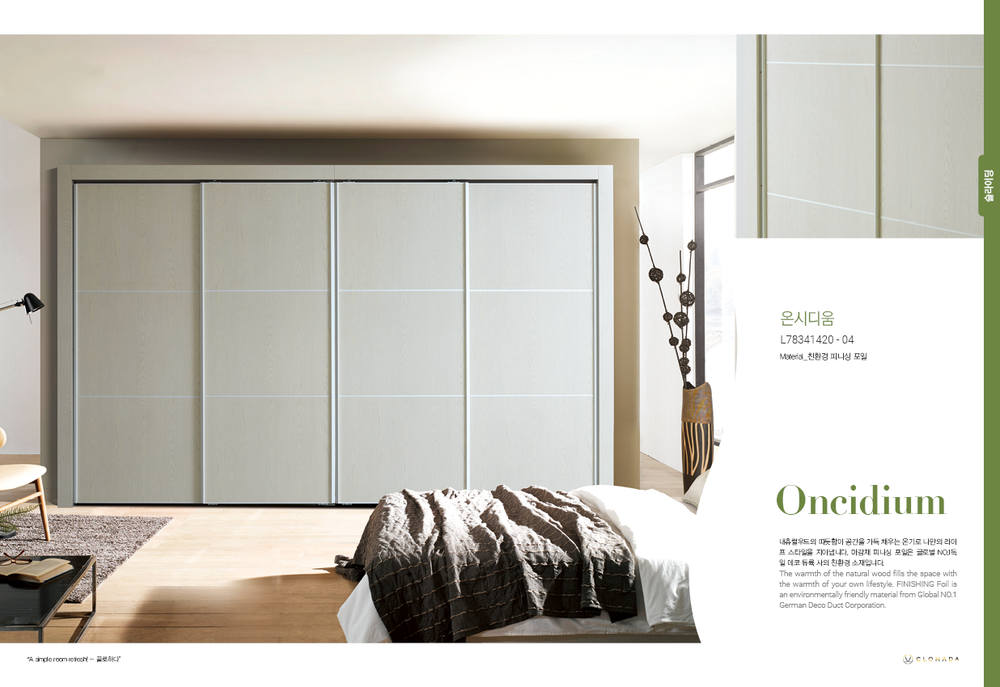 내츄럴우드의 따듯함이 공간을 가득 채우는 온기로 나만의 라이프 스타일을 자아냅니다. 마감재 피니싱 포일은 글로벌 NO.1독일 데코 듀륙 사의 친환경 소재입니다.