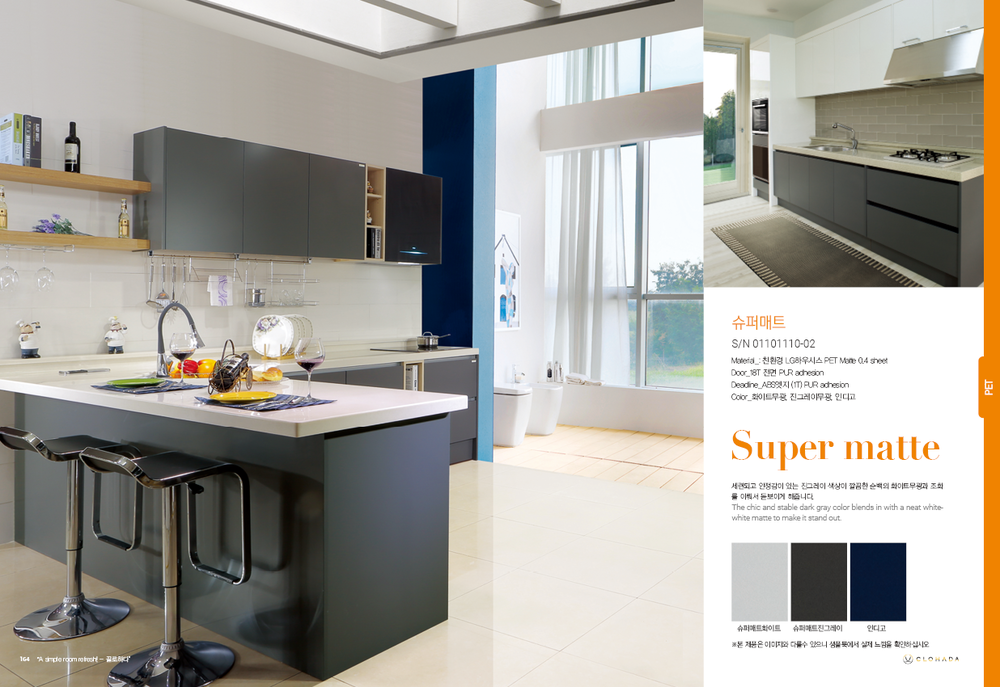 세련되고 안정감이 있는 진그레이 색상이 깔끔한 순백의 화이트무광과 조화를 이뤄서 돋보이게 해줍니다.