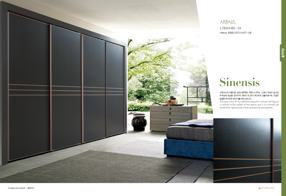 사피아노의 아름다운 결과 중후함이 함께 느껴지는 그레이 색상이 공간의 무게감에 중심을 잡아주며 가운데 띠 장이 포인트로 심플하면서도 조금은 발랄한 포인트로 분위기를 반전시킵니다.