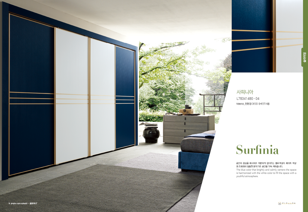 공간의 중심을 화사하고 차분하게 잡아주는 블루색상이 화이트 색상과 조화되어 발랄한 분위기로 공간을 가득 채워줍니다.