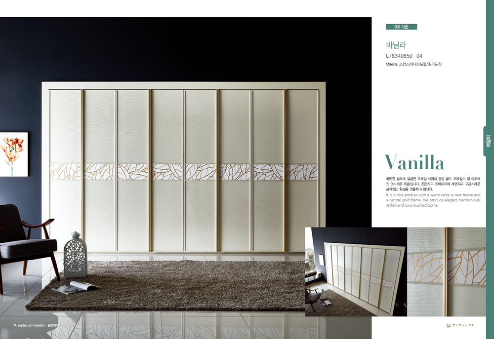 따뜻한 컬러에 깔끔한 프레임 처리와 중앙 골드 프레임이 잘 어우러진 멋스러운 제품입니다. 은은하고 조화로우며 세련되고 고급스러운 품격있는 침실을 연출해 드립니다.